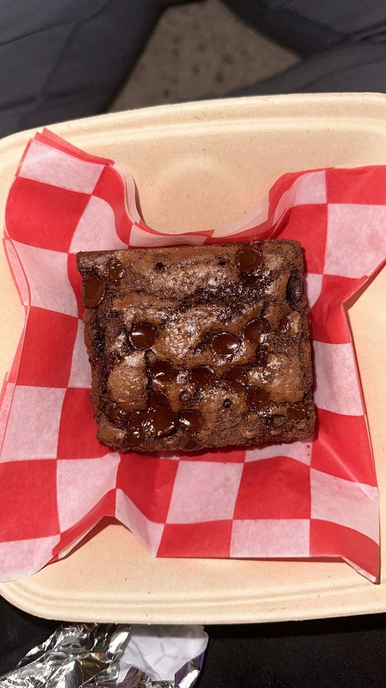 Warm chocolate chunk brownie drizzled with Mike's Hot Honey.