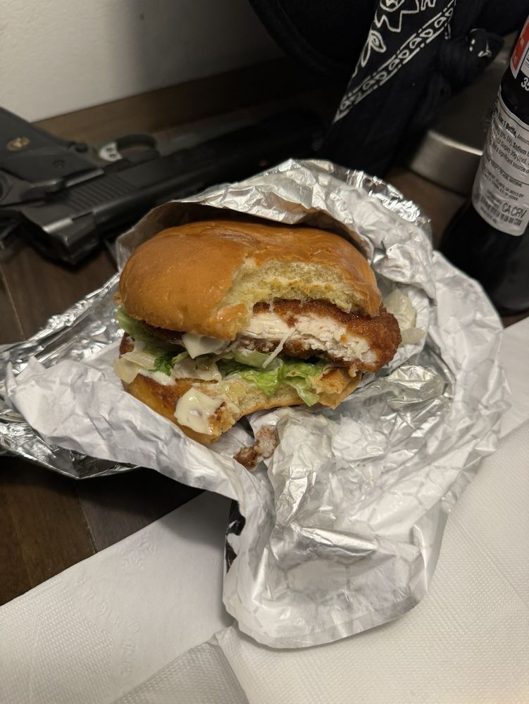 Crispy chicken breast topped with lettuce, tomato, pickles, and mayo on a toasted brioche bun.