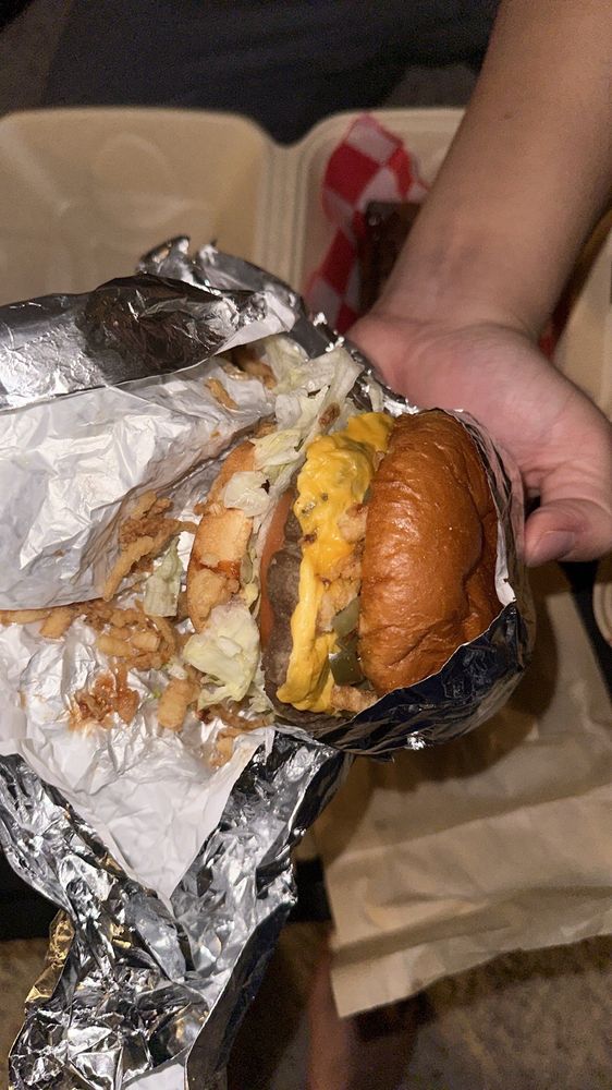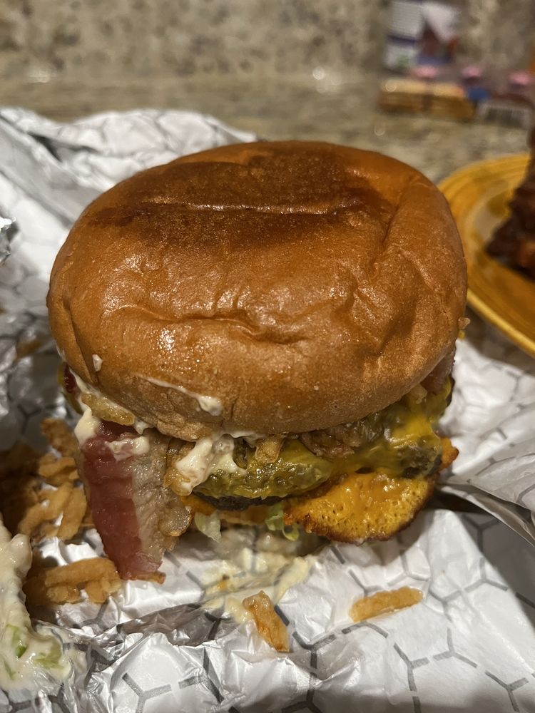 All beef patty topped with melted American cheese, jalapenos, smoky BBQ sauce, crispy fried onions, lettuce, pickles and tomato on a toasted brioche bun.