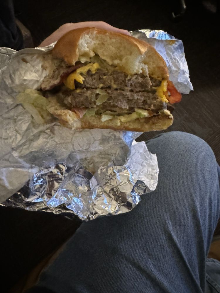 All beef patty topped with melted American cheese, crispy bacon strips,truffle-infused roasted garlic aioil, lettuce, tomato, and pickles on a toasted brioche bun